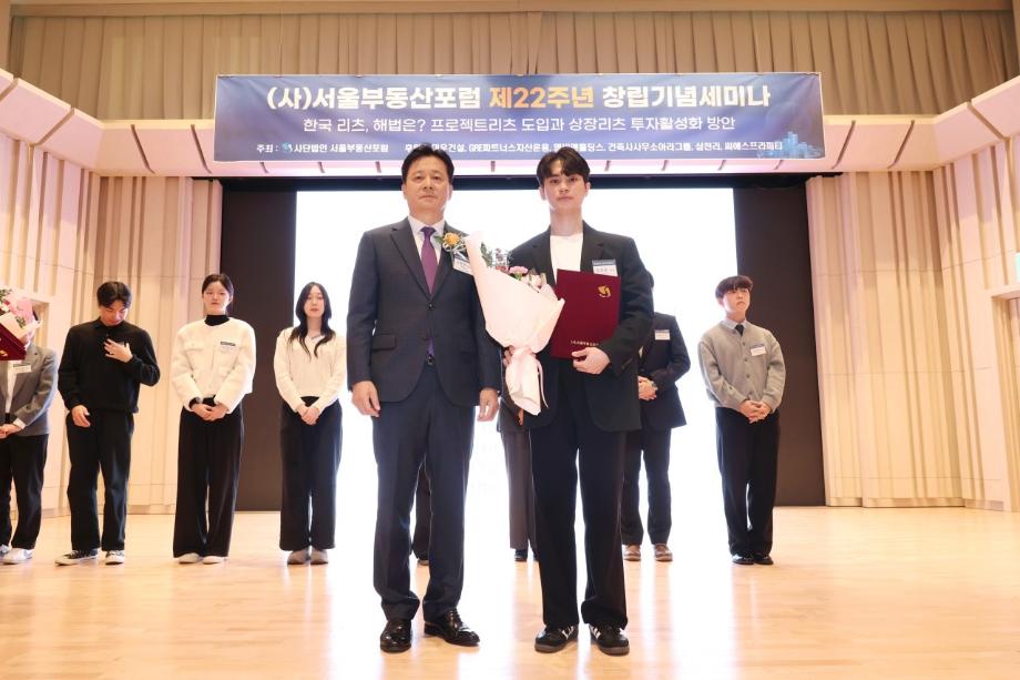 본문 시작 홈으로 학과 소식 학과소개 취업 및 진로 언론 및 보도 학과 소식 대학원 홈페이지가이드 행사사진게시판 행사사진게시판 공지사항 일반자료실 강의자료실 부동산학보 동아리 행사사진게시판 페이스북 트위터 프린트 제12회 서울부동산포럼 부동산지적학과 김관호 학생 장학생 선발 부동산지적학과 405 2025-11-07 행사명 : 제12회 서울부동산포럼 부동산학과 김관호 학생 장학생 선발 일시 : 2025.11.06. (목요일) 13:30 ~16:30 내용 : 부동산지적학과 3학년 김관호 학생이 서울부동산포럼에서 주관하는 '장학생'으로 선발되었습니다. 성실하게 학업과 학교생활에 임해온 학생은 이번 선발로 장학금 100만 원을 수여받았습니다. 학과는 장학생 선발을 진심으로 축하하며, 앞으로도 학업과 다양한 활동에 매진할 것을 응원합니다. 작성자: 부동산지적학과 조교 목록 다음 2025학년도 부동산컨설팅 특강 다음 2025년 2학기 도시경제부동산 대학원 종강모임 담당부서 : 부동산지적학과 담당자 : - 연락처 : 043-649-1369 최종수정일 : 2024-10-26 만족도조사 만족도 조사 이 페이지에서 제공하는 정보에 대하여 만족하시나요? 매우만족 만족 보통 불만족 매우불만족