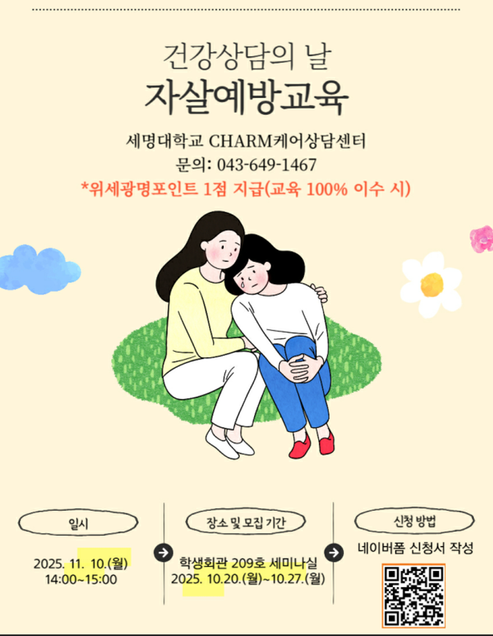 본문 시작 홈으로 학과생활 학과소개 교수소개 교과과정 학과생활 홈페이지가이드 사진게시판 공지사항 사진게시판 전공자료실 동아리 학과행사 사진게시판 페이스북 트위터 프린트 [CHARM케어상담센터] 2025학년도 2학기 자살예방교육 진행 안내 산업디자인학과 229 2025-10-21 목록 이전[긴급공지] 최근 급증 중인 '캄보디아 불법 고용, 납치' 사례 주의 안내 다음 [CHARM케어상담센터] 2025학년도 2학기 알코올중독 예방 및 스트레스 대처 관련 교육 진행 안내 담당부서 : 산업디자인학과 담당자 : - 연락처 : 043-649-1436 최종수정일 : 2024-10-26 만족도조사 만족도 조사 이 페이지에서 제공하는 정보에 대하여 만족하시나요? 매우만족 만족 보통 불만족 매우불만족