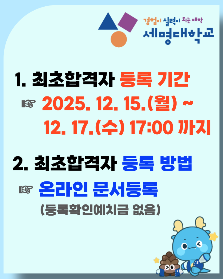 본문 시작 홈으로 학과생활 학과소개 교수소개 교과과정 학과생활 홈페이지가이드 사진게시판 공지사항 사진게시판 전공자료실 동아리 학과행사 사진게시판 페이스북 트위터 프린트 [수시모집] 2026학년도 수시모집 최초합격자 등록안내 산업디자인학과 204 2025-12-15 목록 이전[설경] 세명대학교 설경 다음 [수시모집] 2026학년도 수시모집 충원합격자 발표안내 담당부서 : 산업디자인학과 담당자 : - 연락처 : 043-649-1436 최종수정일 : 2024-10-26 만족도조사 만족도 조사 이 페이지에서 제공하는 정보에 대하여 만족하시나요? 매우만족 만족 보통 불만족 매우불만족